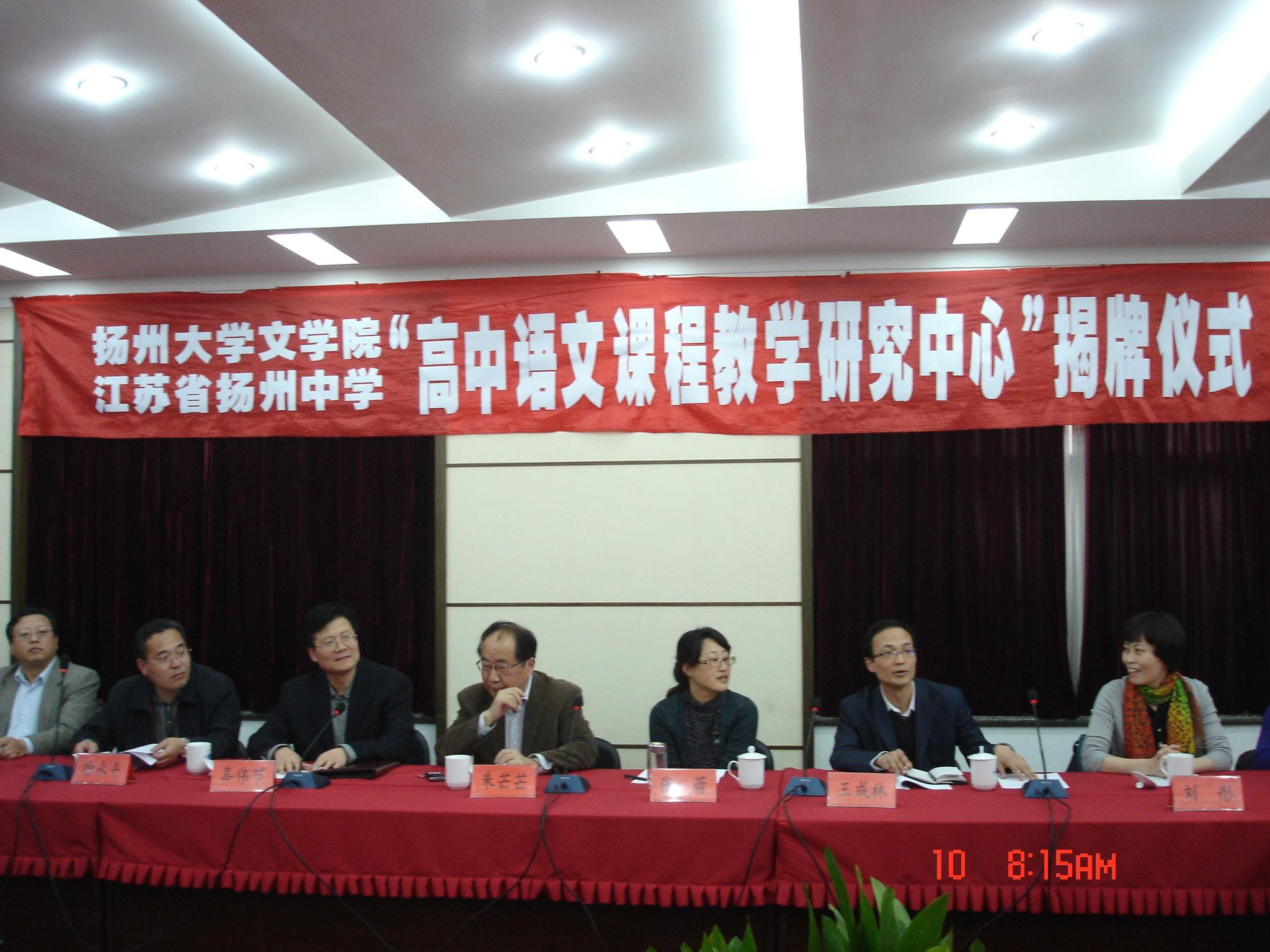 参加“高中语文课程教学研究中心”揭牌仪式的单位有江苏省教研室、扬州市教研室、扬州大学文学院、江苏省扬州中学和《中学语文教学》、《中学语文教学参考》、《语文教学通讯》等多家杂志社。成立大会讨论并通过了《高中语文课程教学研究中心章程》和顾问委员会学术委员会以及名单。扬州大学文学院党委书记柳宏和扬州教研室主任、教科所所长辜伟节为中心揭牌。与会代表一致认为,该“研究中心”的成立堪称强强联合。