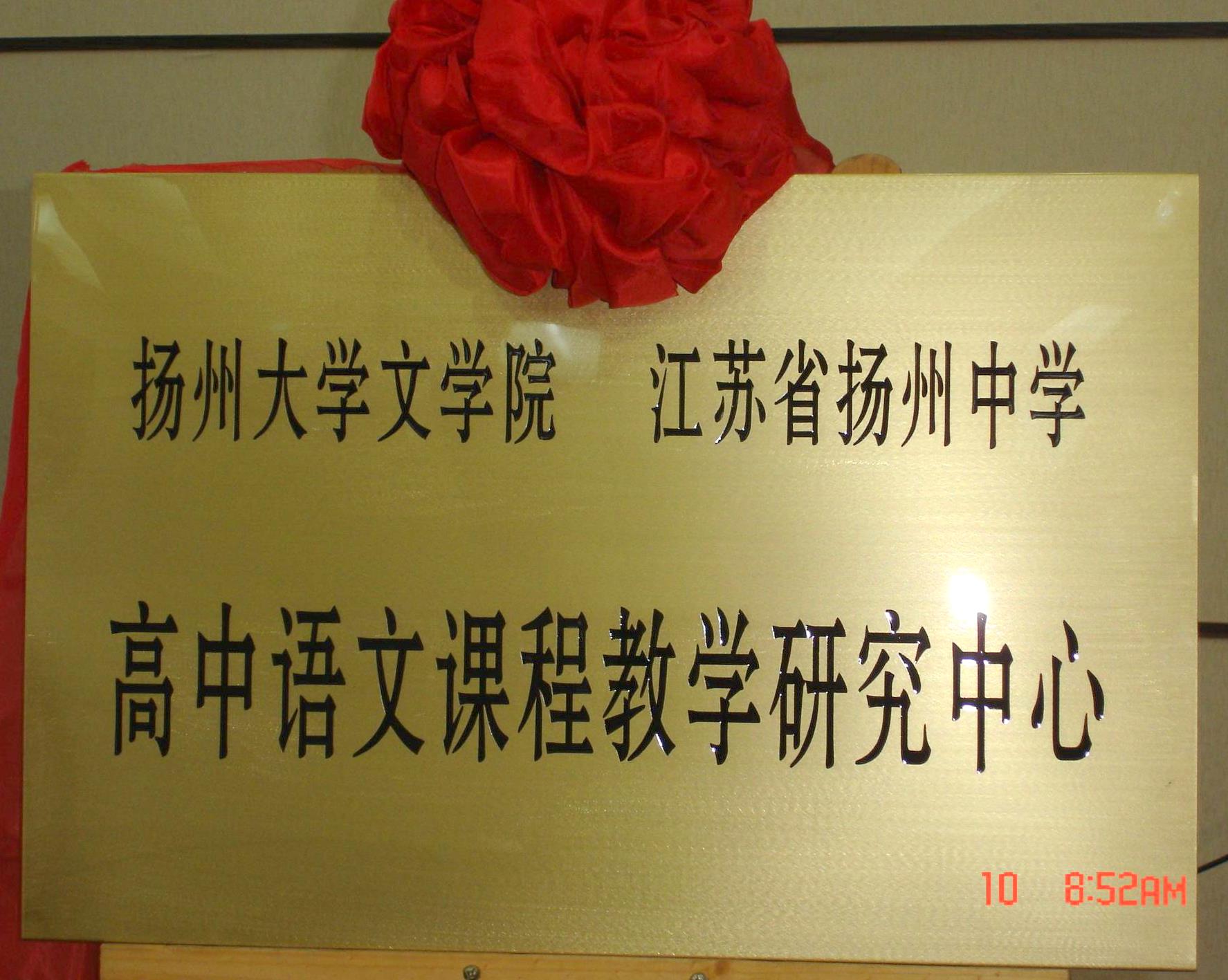 2011年4月10日,扬州大学文学院与江苏省扬州中学合作成立“高中语文课程教学研究中心”,在扬州中学举行了揭牌仪式。该“中心”是以扬州大学文学院和江苏省扬州中学为依托,专门研究高中语文课程教学的学术研究组织。“中心”致力于高中语文课程教学的理论研究和实践研究。研究任务涉及语文教育思想、高中语文课程建设、教材建设、高中语文教学策略与模式、高中语文教师专业发展等诸多方面。